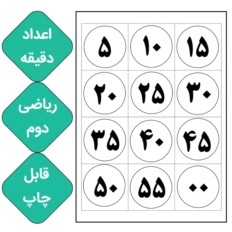 با تهیه فایل اعداد دقیقه و چسباندن آن کنار اعداد ساعت دیواری خانه یا کلاس، به دانش آموزان پایه دوم کمک میکنید تا خواندن و نحوه شمارش دقیقه و ساعت را سادهتر و سریعتر یاد بگیرند.